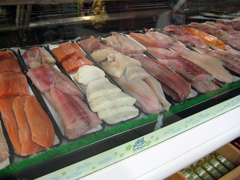 Tokyo Fish Market features a wide variety of fish. Depending on the time of year, we can have over 100 different varieties. Our selection ranges from the popular tuna, salmon, and halibut, to less common selections such as octopus and swordfish.